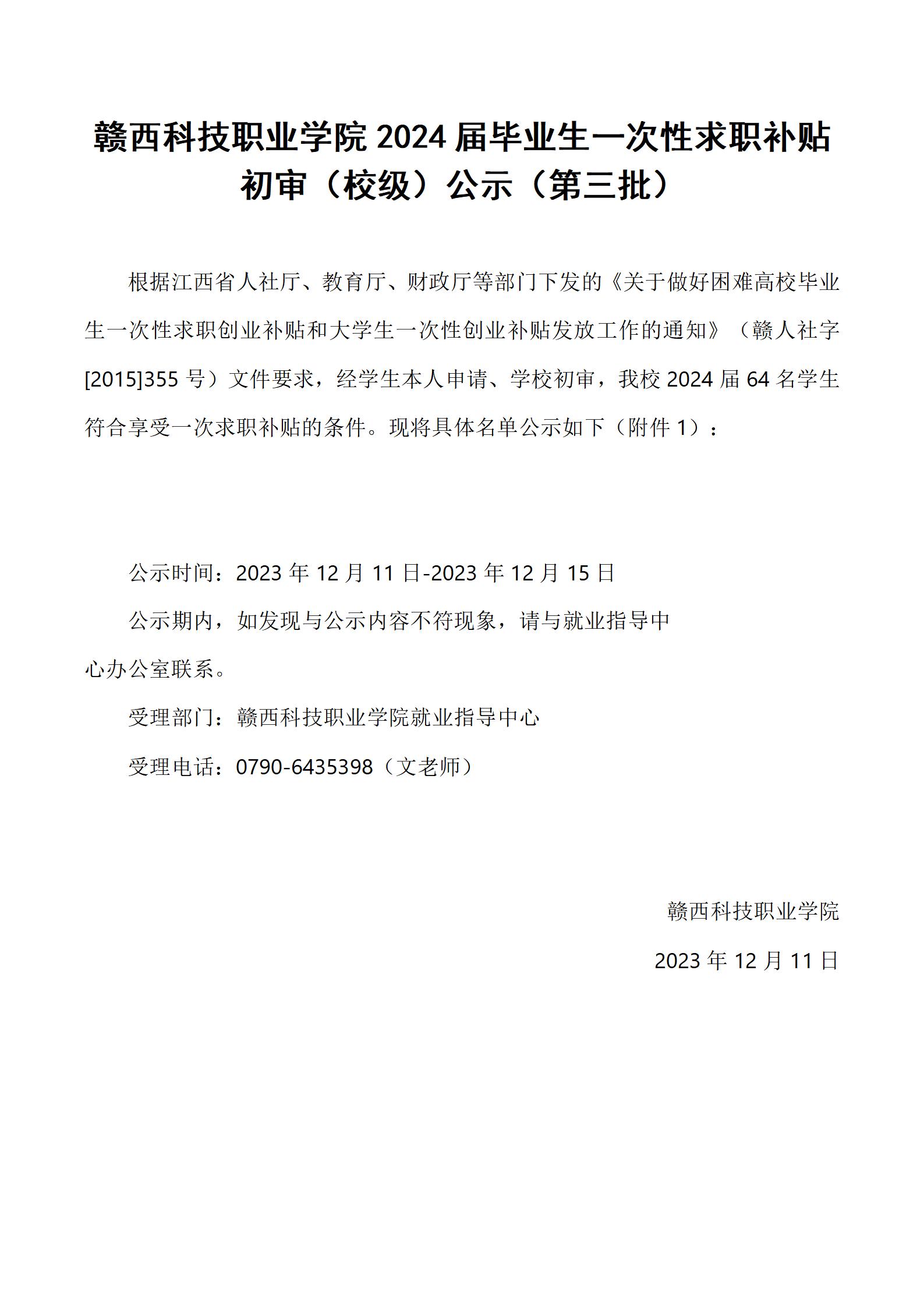 赣西科技职业学院2024届毕业生一次性求职补贴 初审(校级)公示(第三批)