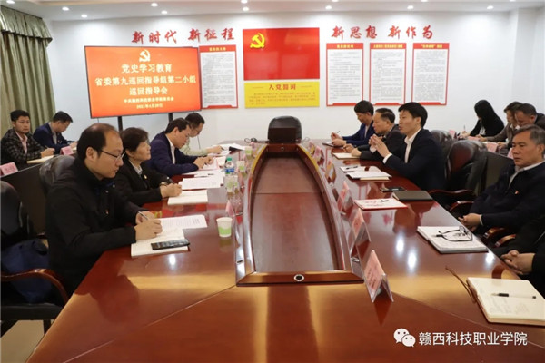 4月29日上午9:00,党史学习教育省委第九巡回指导组第二小组组长陈新、副组长陶风华、联络员万伟韬、成员谢晓文一行莅临赣西科技职业学院调研指导党史学习教育情况。学校全体校领导、各党支部书记、相关部门负责人以及学校党史学习教育领导小组成员参加会议。