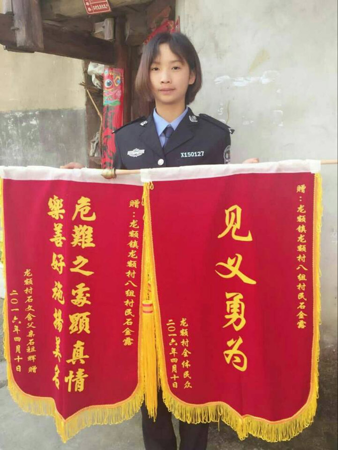 据悉,石金露是今年4月5日从学校请假回家,看望不幸摔伤的母亲,那一天,当锦旗送到石金露的家中时,母亲在病榻上舒展开了久违的笑脸,淳朴善良的母亲连声说道“好!好啊!姑娘有出息!”。5月17日,贵州黎平县龙额镇侗戏班子把18岁侗族姑娘奋勇救人的事迹自编成了侗戏,他们用民族戏剧的形式记录并演绎着这段充满温情的故事,这种临危不惧、见义勇为的精神也必将不断得到弘扬。就在石金露所就读的学校——赣西科技职业学院,万千的师生正在以不同的形式为她喝彩点赞,向石金露学习!向见义勇为的女英雄学习!已成为全体师生共同的呼声!