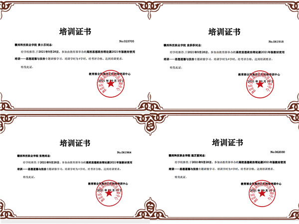 全体思政课教师在全国高校教师网络培训中心网站收看了》《思想道德与法治 》课程培训视频。并按要求完成培训作业后,通过考核获得了培训结业证书。