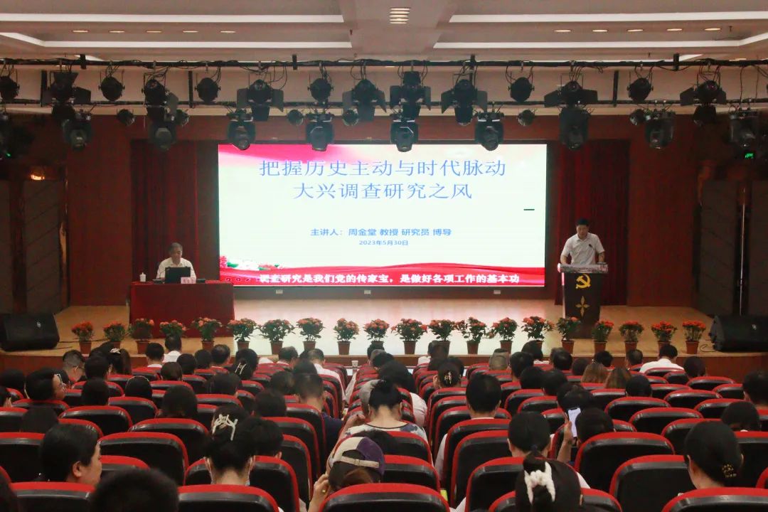 周金堂从“全面深刻把握调查研究的内涵与特质”“毛泽东关于做好调查研究的重要论述”“习近平关于做好调查研究的重要论述”“调查研究的主要功用及主要方式方法”“大兴调查研究之风,高质量推动新时代新发展”五个方面作了全面深入的辅导。