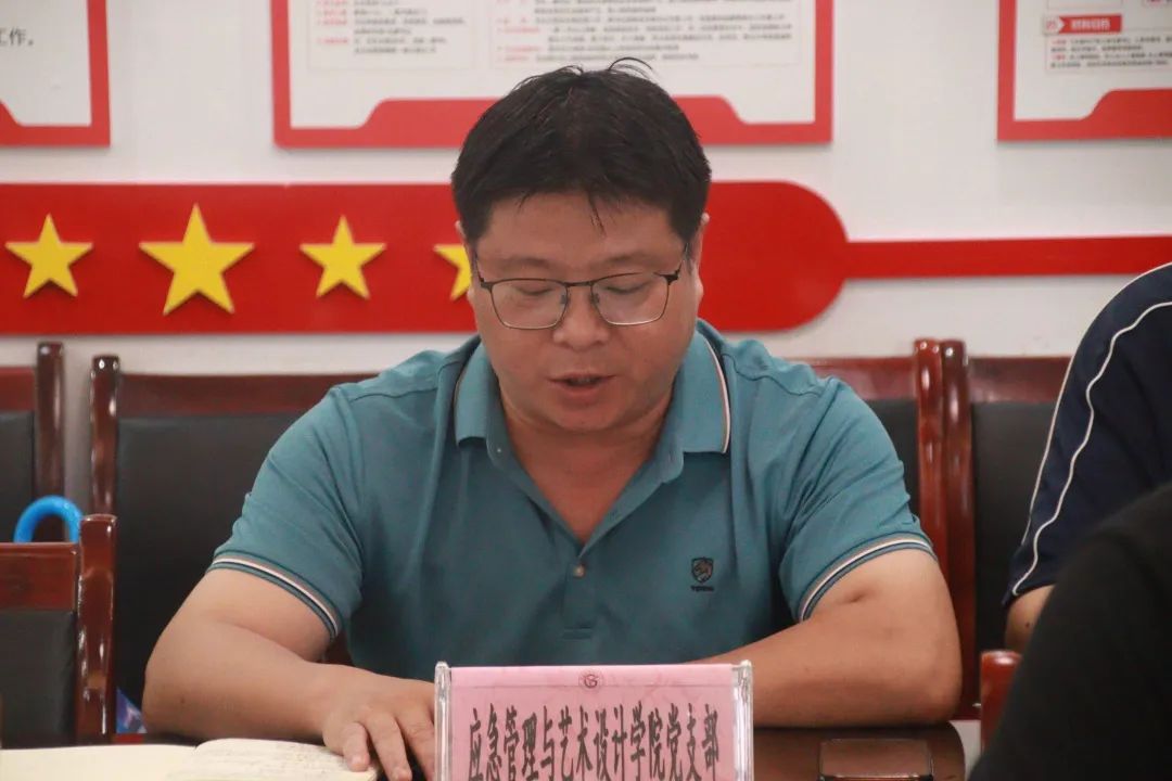 应急管理与艺术设计学院党支部书记敖国平和机关党支部书记张智慧结合各自工作实际作了交流发言,分享了学习心得。