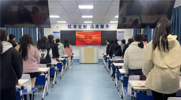 伴随着雄壮的国歌,全体师生肃然起敬,行注目礼,齐唱国歌。