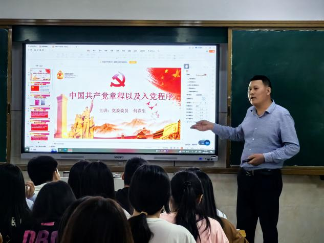 《中国共产党章程及入党程序》 4月21日下午,校党委委员、组织部部长何春生同志为参训学员讲授《中国共产党章程及入党程序》,开启本期培训班“铸魂工程”第一课。何春生同志以党章总纲为核心,结合最新修订内容展开系统讲解。通过多媒体课件生动展示了党徽党旗的构成要素及其政治内涵,重点解读党章11章55条中关于党的性质、行动指南、中央八项规定精神等核心内容。在谈到党的组织建设时,特别强调发展对象确定须经一年以上培养教育,预备党员转正需严格履行“提出申请-支委审查-支部大会讨论表决”等程序规范,并结合高校党建工作实际,通过典型案例分析党的六大纪律具体要求,深入阐释“坚持党要管党、全面从严治党”的深刻内涵。针对学员关心的党团关系问题,明确指出共青团作为党的助手和后备军的政治定位,强调推优入党的规范流程。