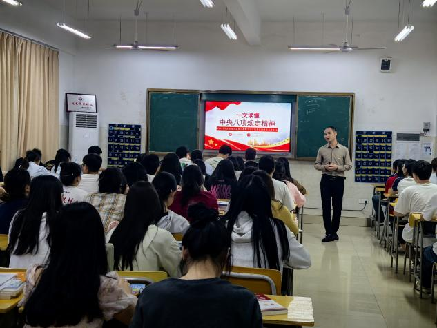 《中央八项规定精神》 为深化全面从严治党要求,强化党员干部纪律规矩意识,政法学院党支部书记曾宪涵带领学员们学习《中央八项规定精神》,系统解读了中央八项规定精神内涵,从中央八项规定出台的历史背景切入,通过数据对比展示十年来党风政风的显著变化。结合“四风”问题新动向,他重点剖析“违规收受礼品礼金”“超标准公务接待”等典型案例,其中某市司法局干部因接受管理服务对象宴请被党内警告处分的实例引发全场深思。作风建设永远在路上,一根烟、一杯酒、一顿饭的“小节”背后,折射的是党性原则的“大问题”。