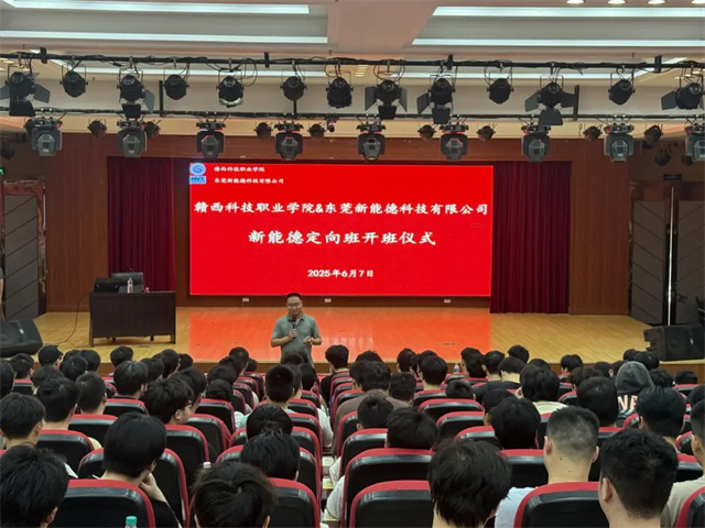 6月7日,赣西科技职业学院与东莞新能德科技有限公司(以下简称“新能德”)联合举办“新能德定向班”开班仪式,标志着双方在新能源产业人才培养领域的深度合作迈入新阶段。此次定向班由智能制造学院与信息技术学院学生共同组成,聚焦智能制造与新能源技术应用,通过“校企双元育人”模式,为区域产业发展输送高技能人才。