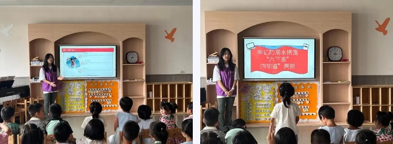 筑牢安全防线:防溺水知识润童心 炎炎夏日,防溺水安全教育刻不容缓。活动伊始,实践队队员们迅速化身为“安全小卫士”,精心准备了生动形象的动画视频、趣味十足的互动问答,为幼儿园的小朋友们带来了一场别开生面的防溺水安全教育课。课堂上,“不能自己去河边玩!”“发现有人溺水要找大人帮忙!”小朋友们积极举手回答问题,稚嫩的声音里满是对安全知识的认真汲取。通过队员们的耐心讲解和引导,孩子们深刻认识到私自下水的危险,安全意识的种子悄然在他们心中种下。