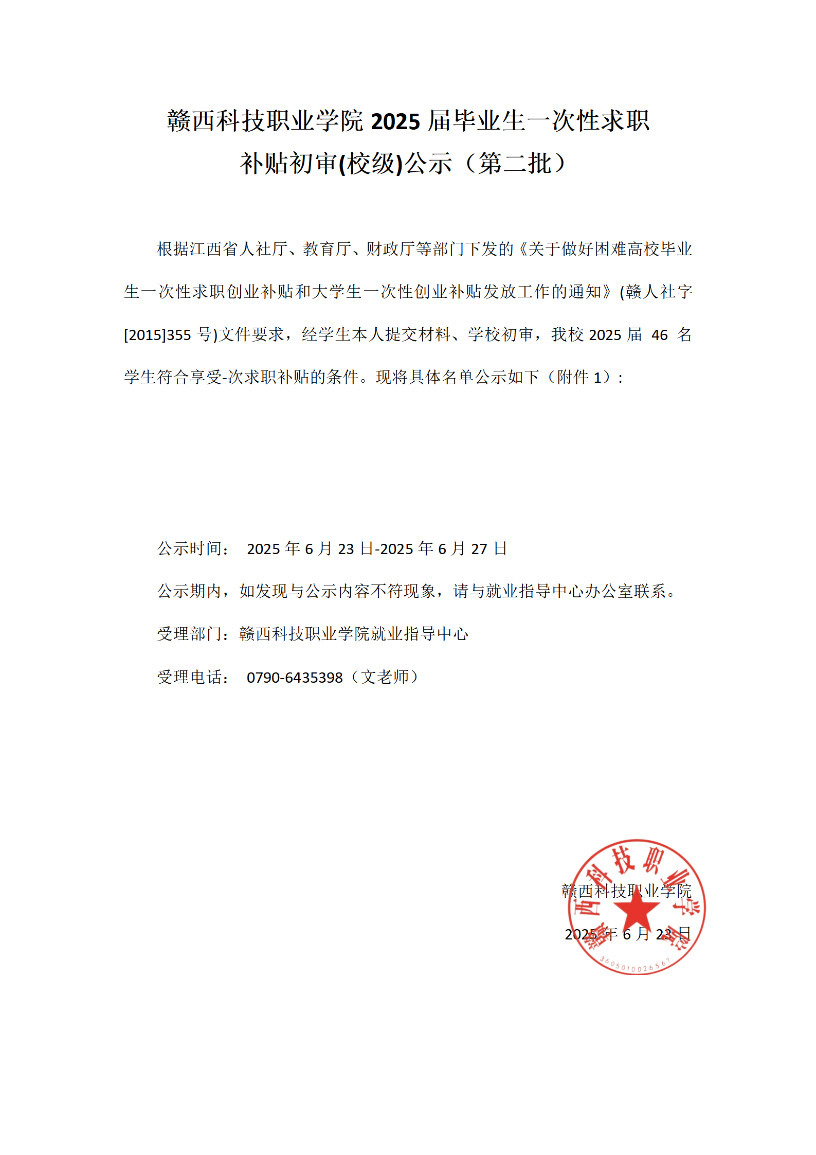 赣西科技职业学院 2025 届毕业生一次性求职补贴初审(校级)公示(第二批)