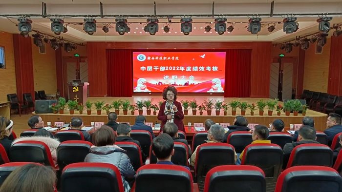 述职会上,中层干部紧紧围绕“德、能、勤、绩、廉”五个方面,对2022年工作取得的主要成效、工作中存在的问题和不足以及下一步工作打算进行了现场述职。述职中,各部门负责人准备充分,PPT课件图文并茂,通过事例阐述、数据说明、图片展示等方式,把过去一年的工作情况和新的一年目标规划,一目了然地展示给大家。丰硕的成果,详实的数据,加上中层干部精彩的讲述,让现场参会人员全方位、多角度的了解了学校各部门2022年的砥砺奋进之路。在认真听取述职报告后,与会人员按照绩效考核评分标准对中层干部及其所在部门实事求是地进行了评议打分。
