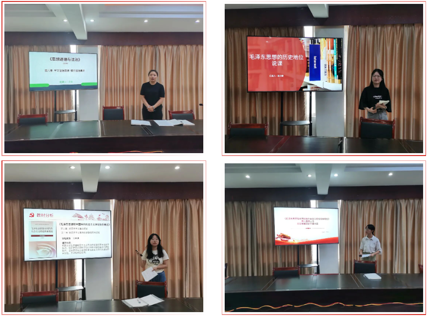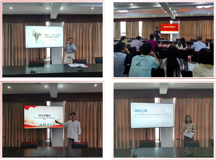 五、专题活动,共同研讨 培训期间,思政部陆续组织开展了《学校教学管理制度、科研制度学习》《如何做好调查研究》《问题式专题化教学展示》《守教育初心琢师者光影》《肩担立德树人使命,争做优秀思政教师》《怎样发挥好思政课关键课程作用》《立师德,树师风》及《新入职教师说课展示》等专题活动,通过研讨交流,老师们增强了做好思政关键课程的使命感,有信心把“六要”素质标准落实在做“可信、可敬、可靠,乐为、敢为、有为”新时代思政教师的具体行动中,有毅力不断提升有“品相”、有“品味”、有“品质”、有“品格”的课堂质量水平,把思政课讲深、讲透、讲活,让学生有获得感、认同感、归属感,为思政课关键课程建设持续发力、恒久创新,培育特色。