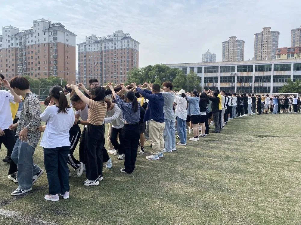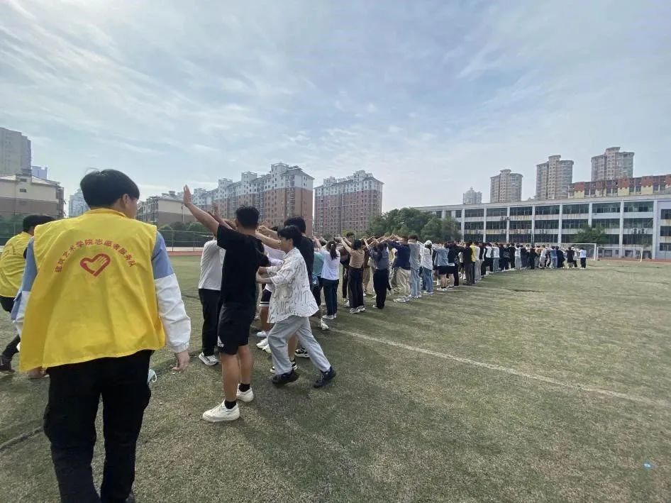 开幕式结束后,同学们移步足球场正中央,手拉手围成圈,进行了一系列破冰小游戏,助于团体完成良好的过渡,让成员互相沟通进而相识,逐渐形成合作互助的氛围。