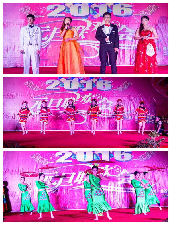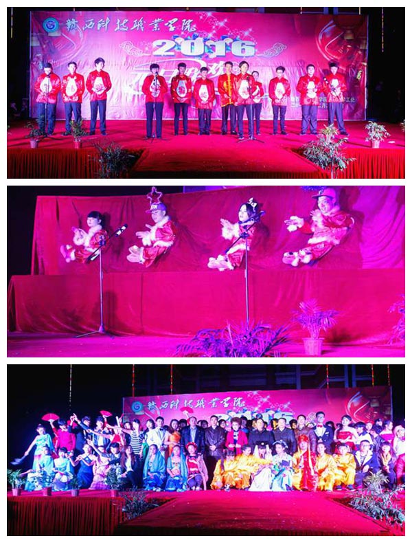 五十六个民族五十六支花,学院来自五湖四海的同学们共同组建了赣西大家庭,晚会开场舞由我院各民族学生代表协力合作的《民族大联欢》拉开帷幕!这也正符合我院团结一致,众志成城、万众一心的奋斗精神!现代芭蕾演绎的《致青春》更是充分展现了懵懂少年的那份热血与浪漫!相声《新五官争功》、小人舞《恭喜发财》、小品《十二生肖大拜年》、情景剧《千年等一回》、双簧《新春乐翻天》更是嬉闹连连,喜笑颜欢,不禁让人捧腹大笑。《琴棋书画》展示着我院学生发展的丰功硕果。歌伴舞《青藏高原》、《怒放的生命》唱出了心灵深处的声音,舞蹈更是展现了高原的恢宏和生命的绽放。魔术不甘落后,带着我们共同畅游了一片《魔幻世界》的海洋,一声声惊叹此起彼伏。古典舞《忆江南》似乎带我们穿越在一个宁静安详的时光隧道内,安详的场景回放在心中,涌起一股股思乡的暖流。《多彩的时装秀》缤纷而至,一位位身着晚装、欧美风格服装、泳装的表演者,踏着T台的步伐牵动着观众们的眼睛。吸引眼球的是学院董事长詹慧珍亲自带领的教师代表队带来的旗袍秀,她们婀娜多姿、典雅唯美、端庄大方地尽现女教师的风韵之美。《赣绣风》作品秀突显我院的办学特色,预示着学院用的方式编织着美好未来。《潇洒女警》彰显飒爽英姿,别样美感触动视觉感官!B-BOX《我的天空》,带着其律动感,以纯人声的口技伴奏和演唱征服了现场所有观众。则在激昂的《舞动青春》旋律中宣告二零一六年元旦联合晚会落下帷幕!