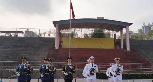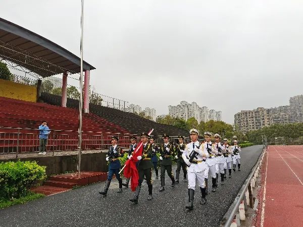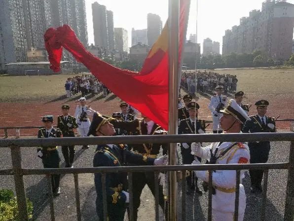 升旗仪式开始,全体队员迈着整齐矫健的步伐,在全校师生面前走过。行至升旗台,仪仗队全体立正,站立笔直。国歌响起的一刹那,升旗手右脚向前迈一大步,右手将国旗往斜上方45度用力一抛,全体师生充满自豪地看着鲜艳的五星红旗缓缓升起,迎风飘扬。