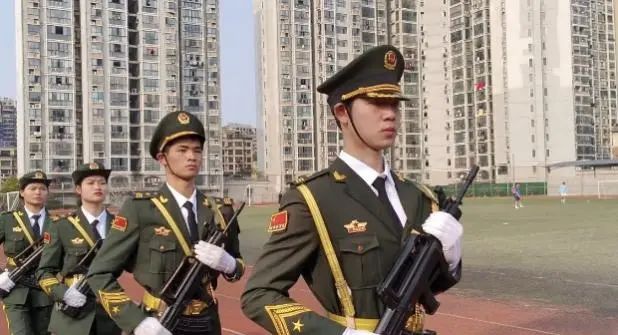 每周一早上国旗仪仗队是一道亮丽的风景线。室友们还在熟睡时,他们便伴着初升的太阳赶赴国旗台下,等待着师生们的到来,国旗仪仗队全体队员身着陆、海、空三色军装,队员们英姿飒爽,神气十足。