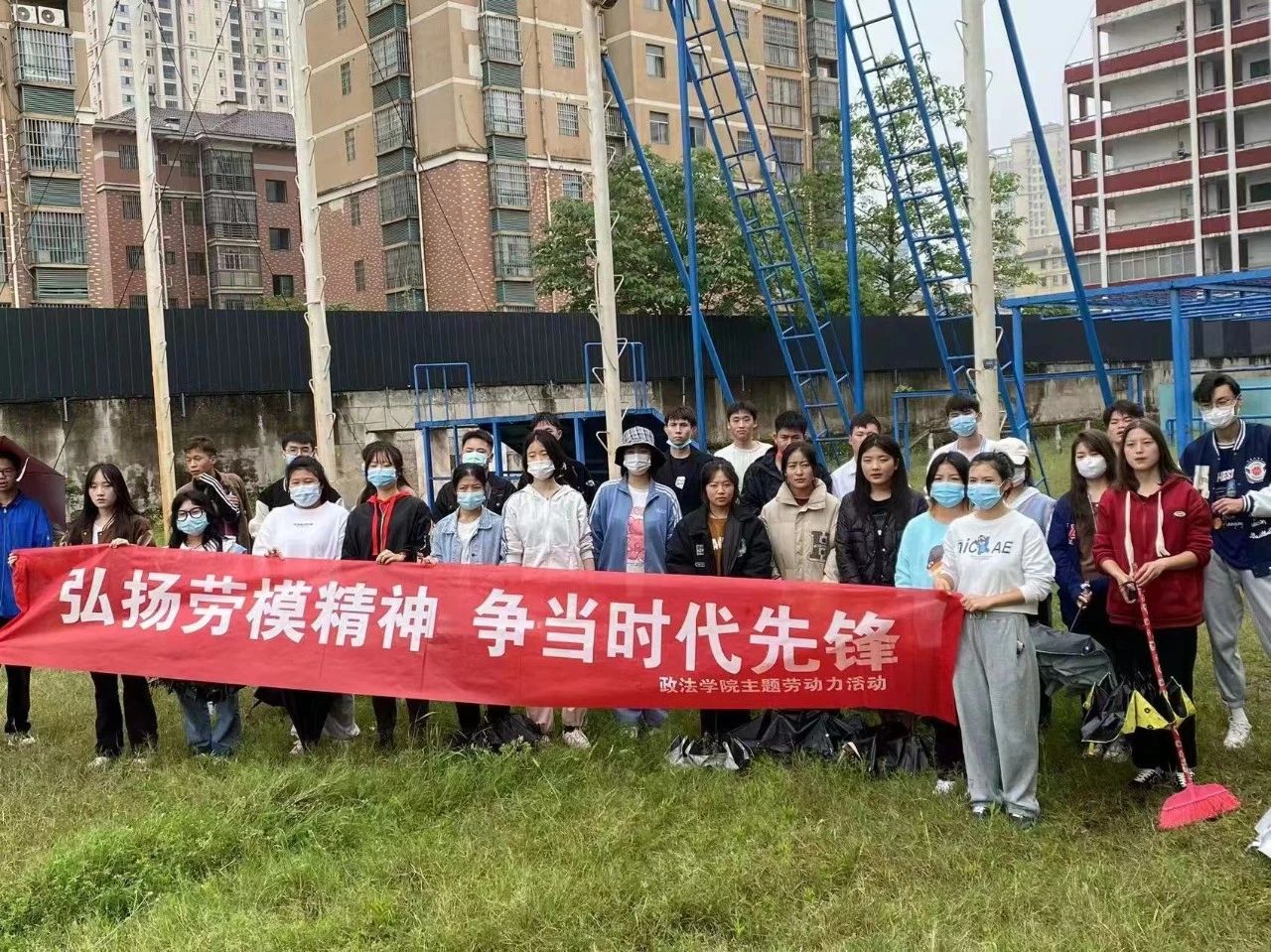 防疫不松懈,劳动不停歇。为庆祝“五·一”国际劳动节,5月1日下午政法学院组织学生干部在校内开展志愿服务,打扫校园各处卫生。